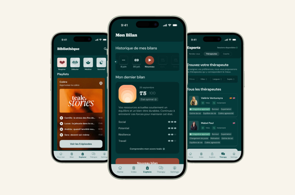 teale adopte une approche holistique de la santé mentale. La plateforme propose un indice de santé mentale basé sur un questionnaire scientifiquement validé, des contenus personnalisés et l’accès à des séances avec des psychologues ou des coachs, dans un cadre strict de confidentialité.